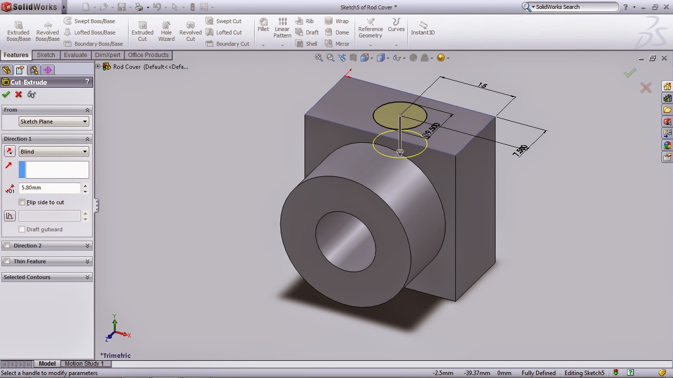 Click Features and click Extrude Cut. Fill the size 5.8 (5,8 mm) on a Design Features Manager. Then click the green checklist.