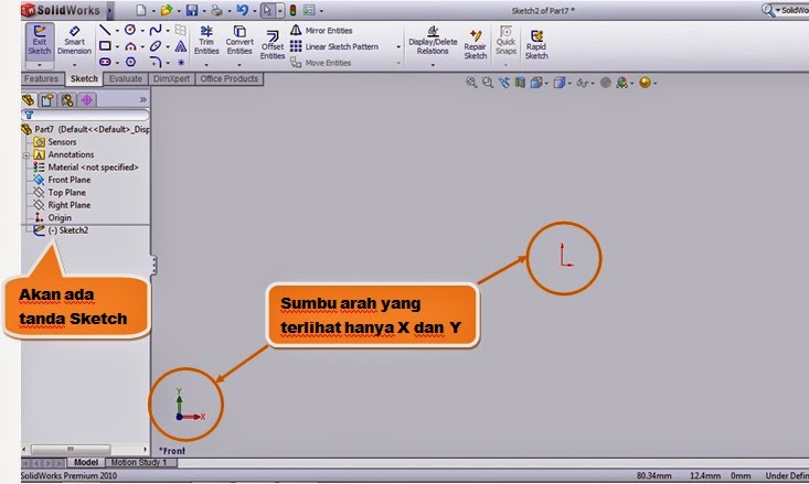 - After the displays of front plane appear, drag your cursor to the center screen or the design space, until the front plane line getting yellow like in an image above then click it. When you finish of choosing your sketch with a front plane. And the displays would be like this.