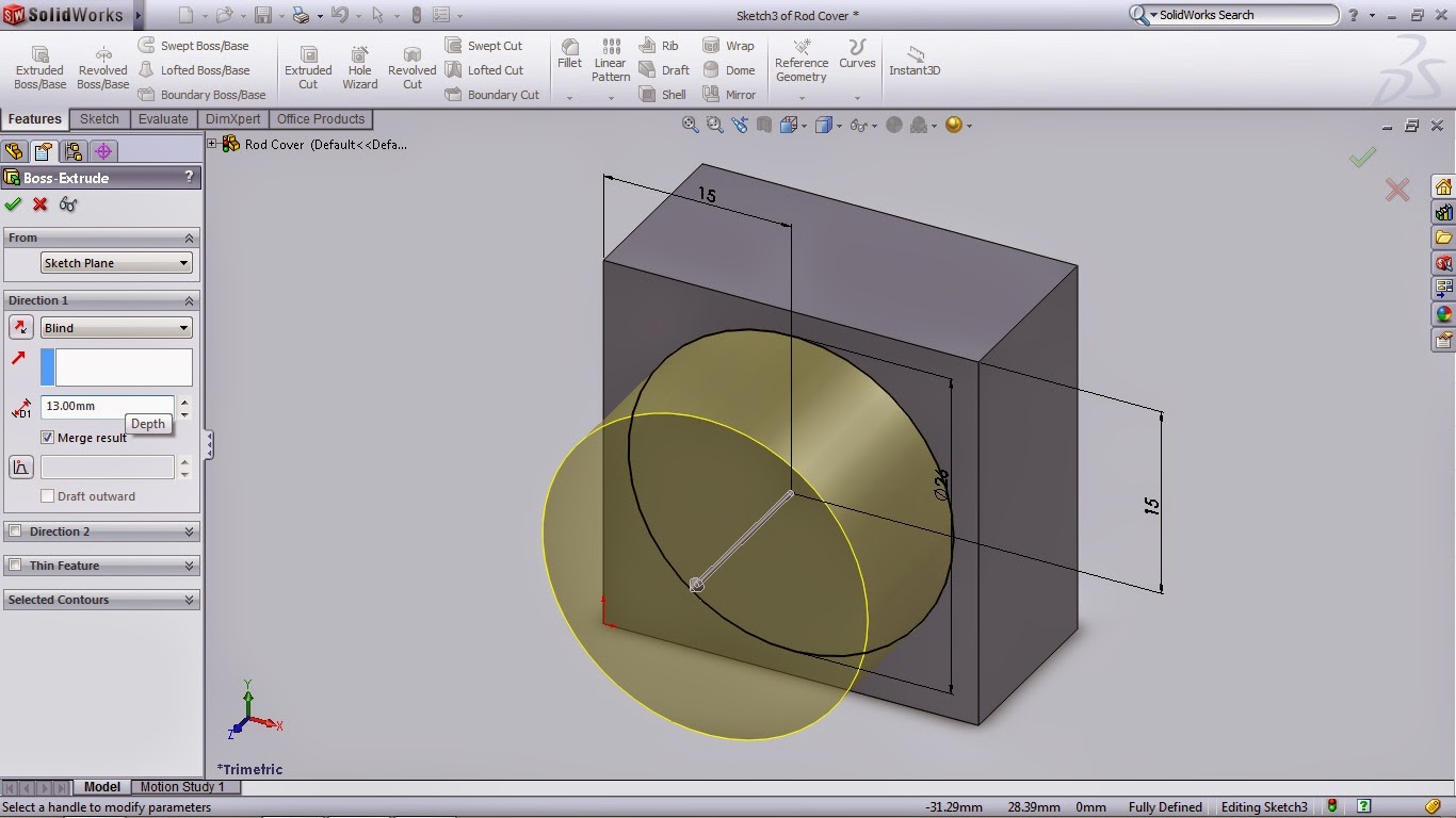 Click Features then click Extrude Boss/Base. Then input Depth Extrude size 13 (13 mm), then click the green checklist. Look this bellow image and look at the instruction to fill the parameter extrude on Design Features Manager.