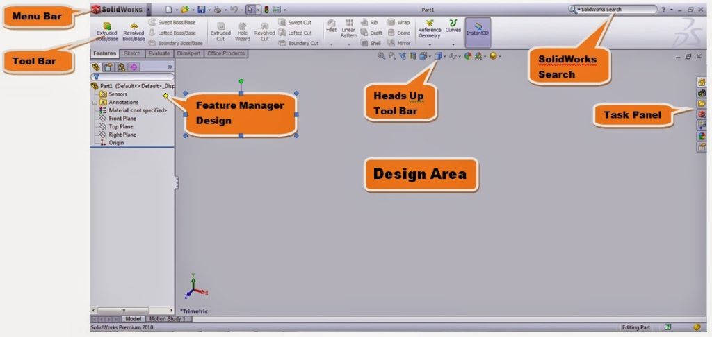 This is the visible image from the basic display of Solid Works before the software’s run. There are many kind of features which are served by Solid Works. Started from drawing part model then metal sheet and etc. In this software, we can also use engineering analysis such as a stressed analysis or fluid flow analysis.
